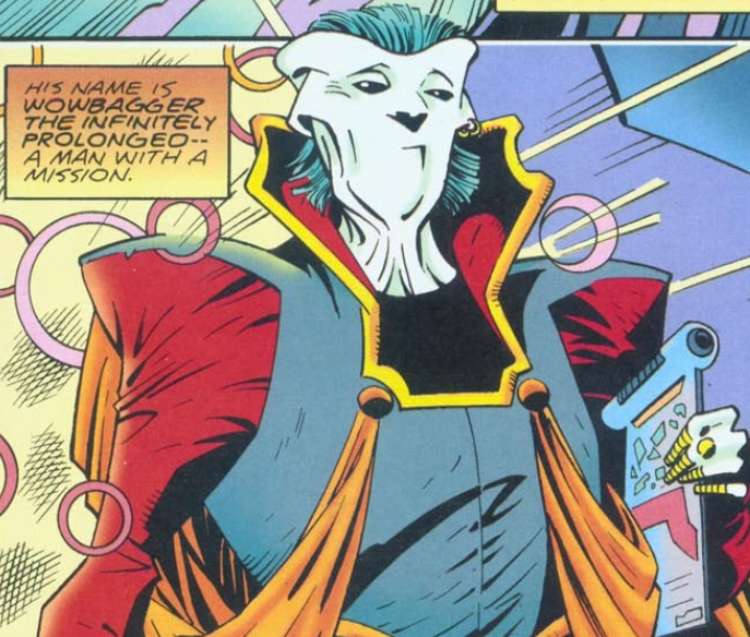 Bowerick Wowbagger the Infinitely Prolonged was a being who became immortal after an accident with a few rubber bands, a liquid lunch, and a particle accelerator. After a period of total boredom, especially on Sunday afternoons, he decided to insult everyone in the entire universe in alphabetical order.